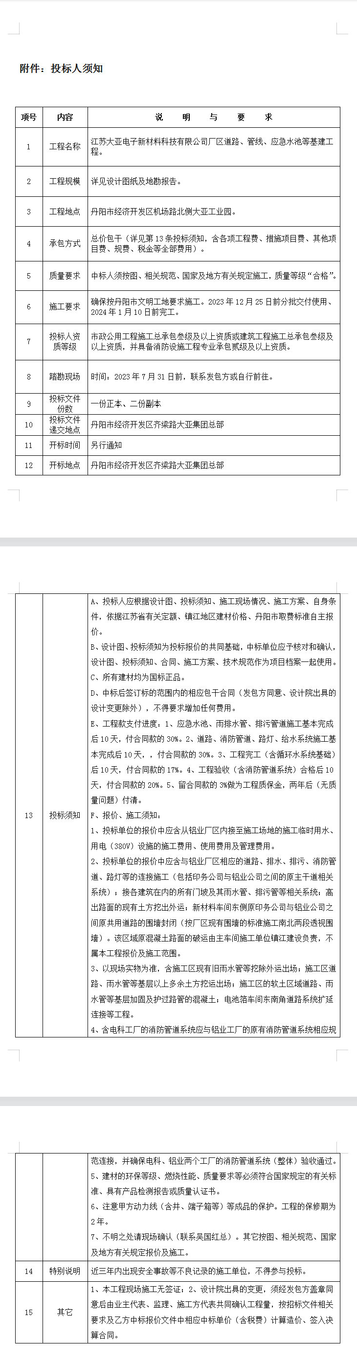 本招標(biāo)項(xiàng)目 廠區(qū)道路、管線、應(yīng)急水池等基建工程 已批準(zhǔn)建設(shè),招標(biāo)人為 江蘇大亞電子新材料科技有限公司 ,建設(shè)資金來(lái)自 自籌 。項(xiàng)目已具備招標(biāo)條件,現(xiàn)進(jìn)行公開(kāi)招標(biāo),特邀請(qǐng)有興趣的潛在投標(biāo)人(以下簡(jiǎn)稱申請(qǐng)人)提出資格預(yù)審申請(qǐng)。