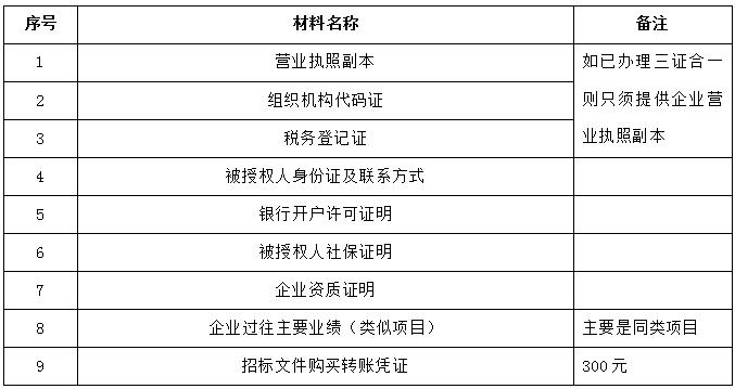 2、 凡有意向參加投標者,請在上述期間內按下表提供報名資料,相關證明文件的原件如無法提供原件則提供復印件加蓋公司公章,投標人須將上述資料的掃描件發(fā)郵件至招標聯(lián)系人處進行報名。