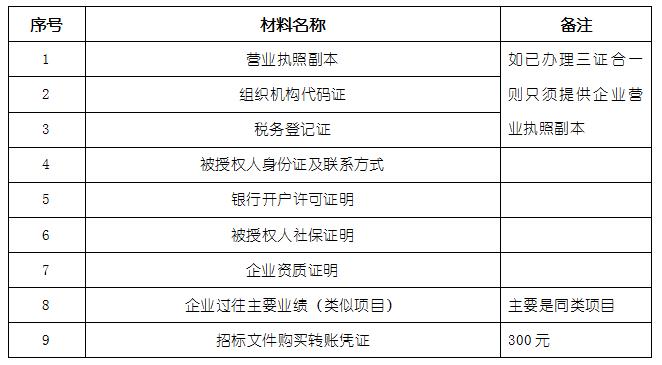 2、 凡有意向參加投標(biāo)者,請在上述期間內(nèi)按下表提供報名資料,相關(guān)證明文件的原件如無法提供原件則提供復(fù)印件加蓋公司公章,投標(biāo)人須將上述資料的掃描件發(fā)郵件至招標(biāo)聯(lián)系人處進行報名。