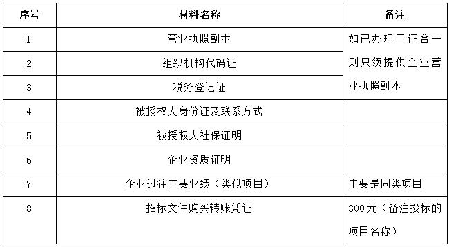 2、 凡有意向參加投標者,請在上述期間內(nèi)按下表提供報名資料,相關(guān)證明文件的原件如無法提供原件則提供復(fù)印件加蓋公司公章,投標人須將上述資料的掃描件發(fā)郵件至招標聯(lián)系人處進行報名。