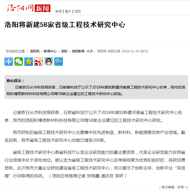 日前,省科技局公示2018年度擬建河南省工程技術中心名單,洛陽科博思新材料科技有限公司榜上有名。省級工程技術研究中心是省科技廳認定企業研發能力的最主要資質,代表企業研發能力在我省行業領域中處于領先地位??撇┧即舜潍@批省級工程技術研究中心,是省科技廳對科博思科研實力和科研平臺的肯定。